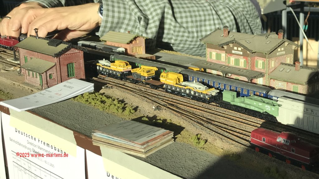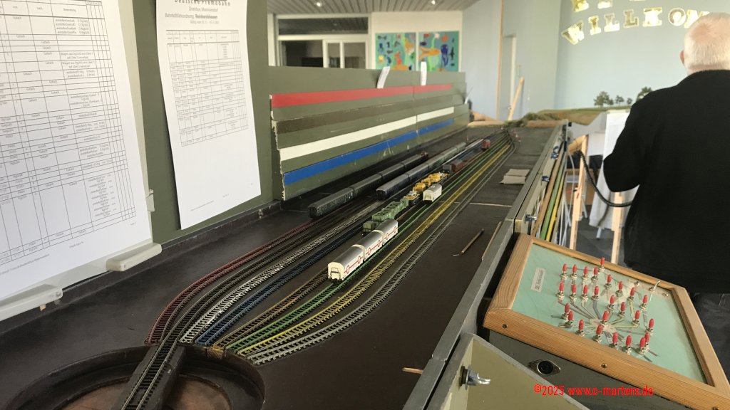 Die Grundaufstellung der Loks und Wagen auf dem betriebsbereiten Arrangement einschließlich der mit Frachtzetteln bestückten Wagenkarten konnte am Freitag noch vor dem Abendessen abgeschlossen werden. Am Abend wurde dann noch erfolgreich ein Fahrplan gefahren.