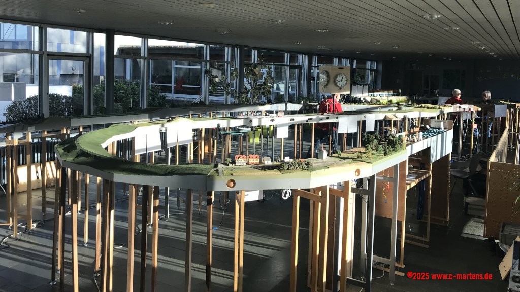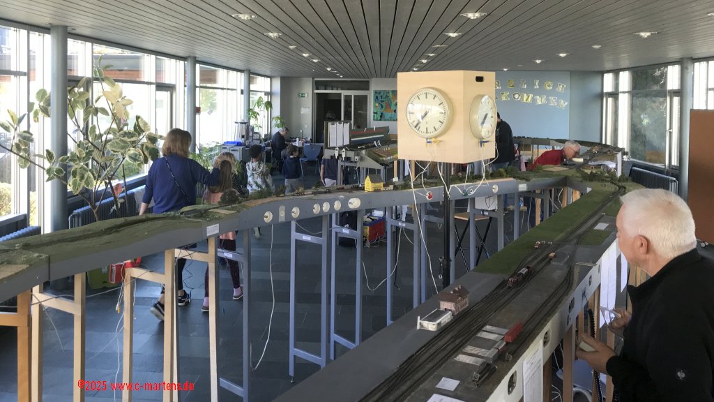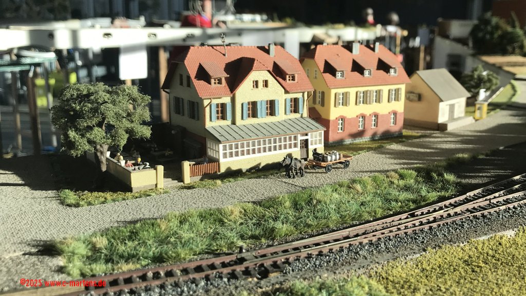 In der Pausenhalle einer Grund- und Realschule in Mammendorf fanden die N-Bahner Unterschlupf2025 haben die süddeutschen N-Bahner ein schönes Arrangement zusammen gestellt. Das N-Layout 2025 im ÜberblickDurchfahrt eines Dg durch den Bahnhof Übenbach bei schönstem AbendlichtDer Bahnhof Gutach wurde von einem Vereinsmitglied aus Barcelona mitgebracht!Einfach nur Landschaft auf einem Signalmodul (ohne Signal, nur mit Signalschacht)Ländliche Idyllen mit Gartenwirtschaft Einer von drei SchattenbahnhöfenLinks im Hintergrund sind Schüler einer Grundschulklasse zu sehen, die von unserem Spiel ganz fasziniert warenFür die Feuerwehr-Fans gab es eine Extra-Vorführung